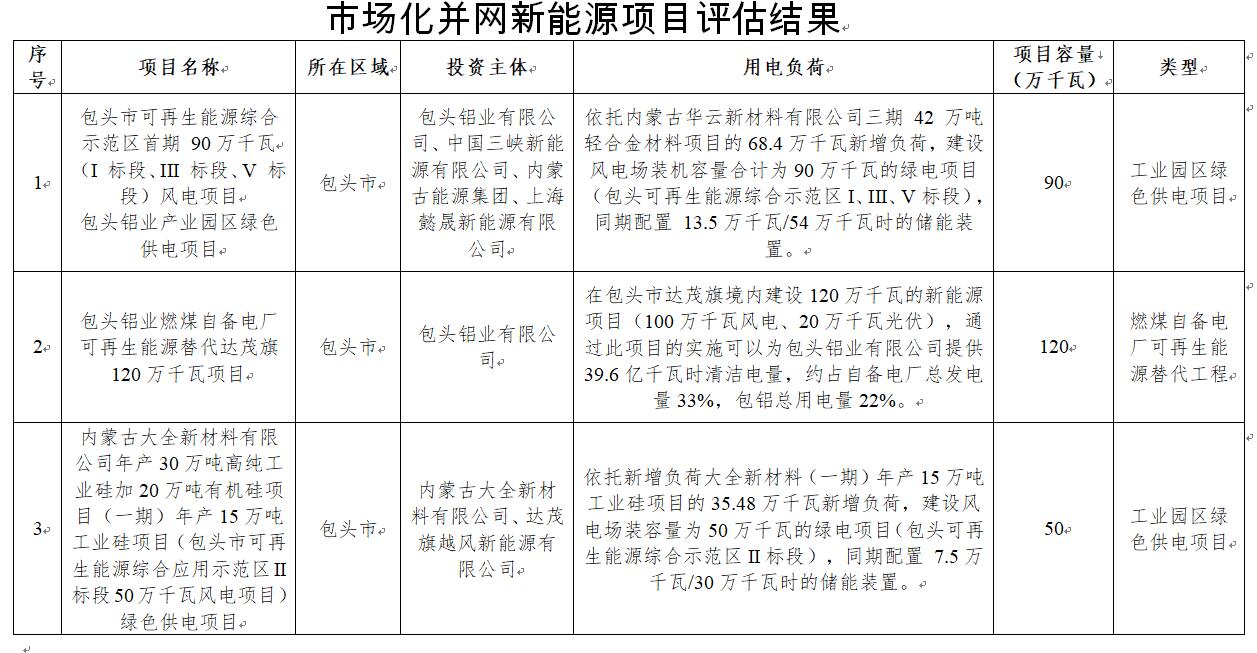 從內(nèi)蒙古能源局獲悉:12月6日,內(nèi)蒙古自治區(qū)能源局印發(fā)關(guān)于實施包頭鋁業(yè)產(chǎn)業(yè)園區(qū)綠色供電項目、包頭鋁業(yè)燃煤自備電廠可再生能源替代項目、內(nèi)蒙古大全新材料有限公司綠色供電項目的通知,按照《內(nèi)蒙古自治區(qū)工業(yè)園區(qū)綠色供電項目實施細則》、《內(nèi)蒙古自治區(qū)燃煤自備電廠可再生能源替代實施細則》要求,自治區(qū)能源局組織評估單位和專家在《包頭市新能源新場景應(yīng)用方案》的基礎(chǔ)上,對包頭市申報的市場化新能源項目子方案進行了評估,3個項目均納入市場化新能源項目清單,共配建新能源規(guī)模260萬千瓦,其中風電240萬千瓦、光伏20萬千瓦。