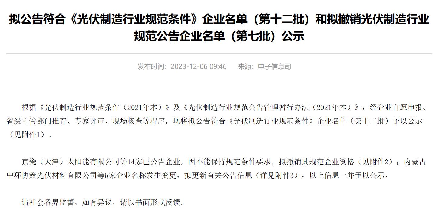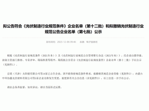12月6日,工信部發(fā)布擬公告符合《光伏制造行業(yè)規(guī)范條件》企業(yè)名單(第十二批)和擬撤銷光伏制造行業(yè)規(guī)范公告企業(yè)名單(第七批)公示文件。