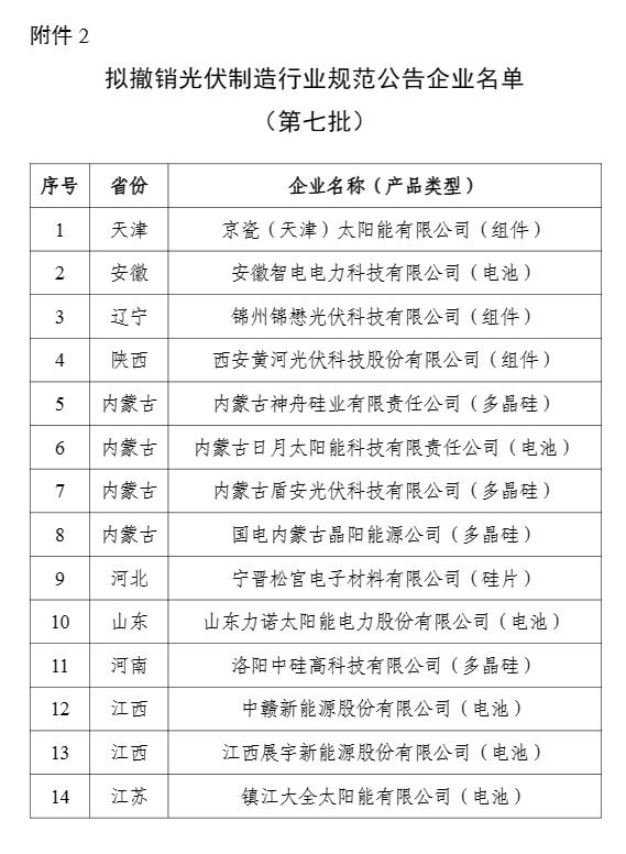 京瓷(天津)太陽能有限公司等14家已公告企業(yè),因不能保持規(guī)范條件要求,擬撤銷其規(guī)范企業(yè)資格(見附件2);內(nèi)蒙古中環(huán)協(xié)鑫光伏材料有限公司等5家企業(yè)名稱發(fā)生變更,擬更新有關公告信息(詳見附件3),以上信息一并予以公示。