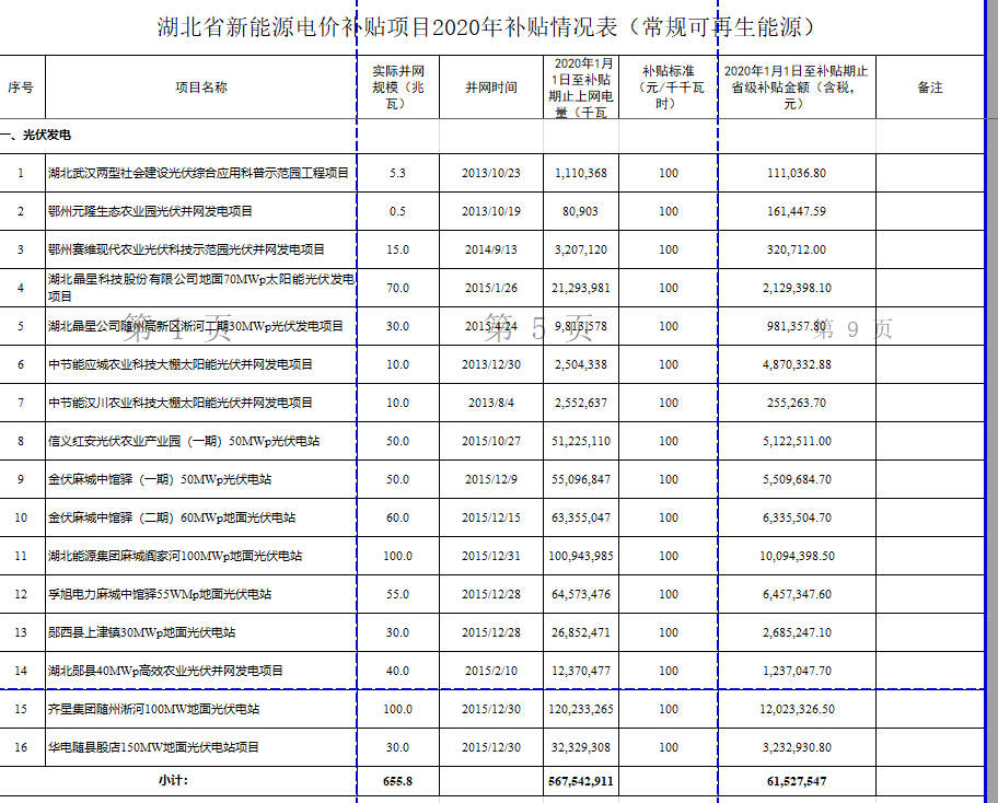 附件:1.湖北省新能源省級電價補貼項目2020年補貼情況表(常規(guī)可再生能源)