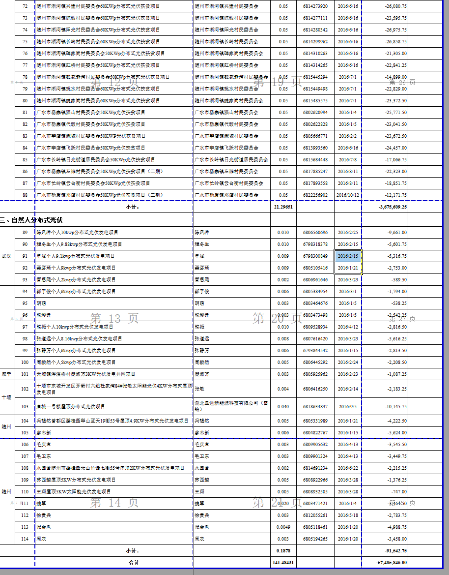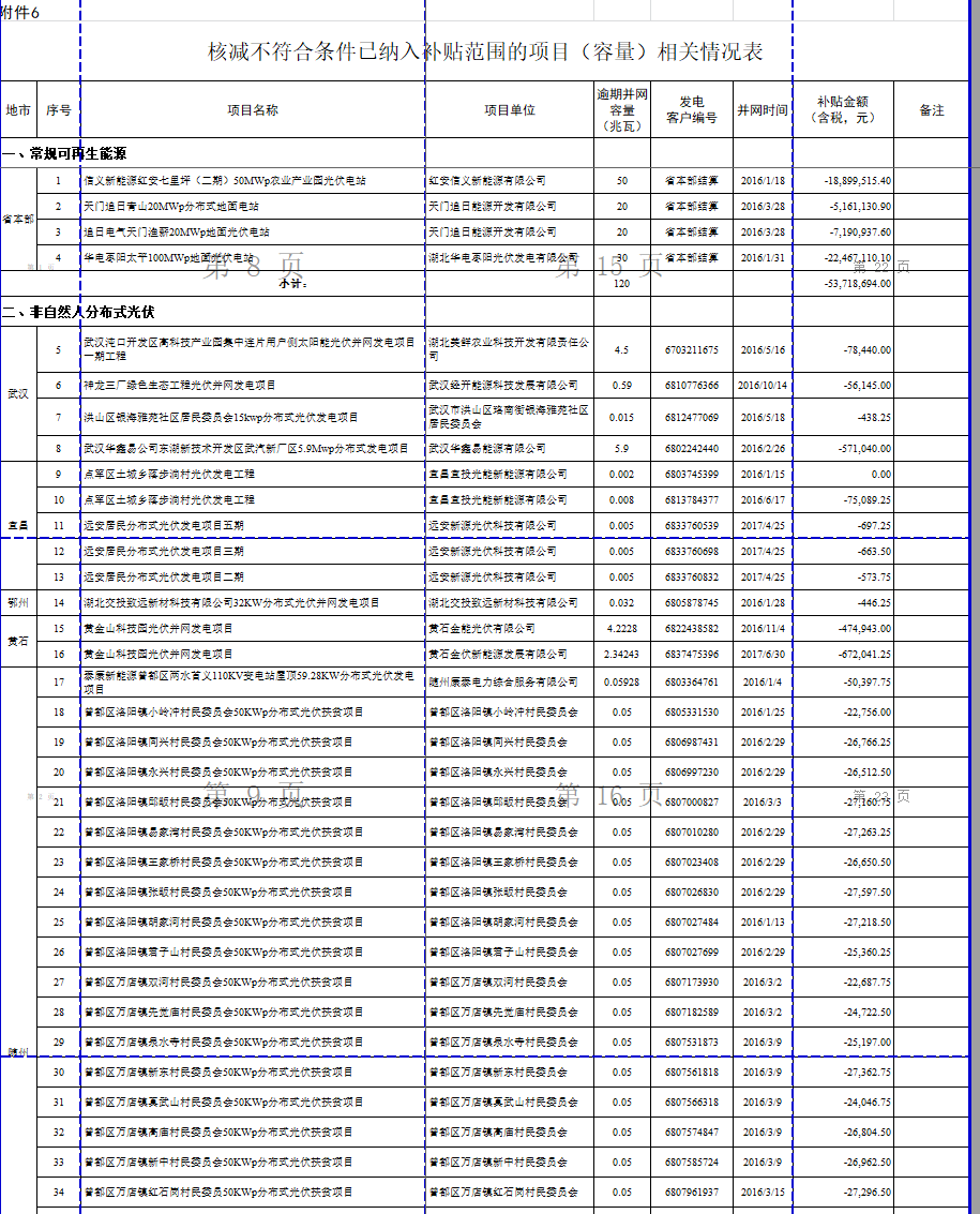 四、對不符合條件(如部分容量或全容量在2016年以后并網(wǎng)的)但前期納入補貼范圍的項目,測算不應納入補貼范圍的電量,扣減已發(fā)放補貼金額。此類項目共114個,扣減補貼5748.58萬元,具體見附件6。