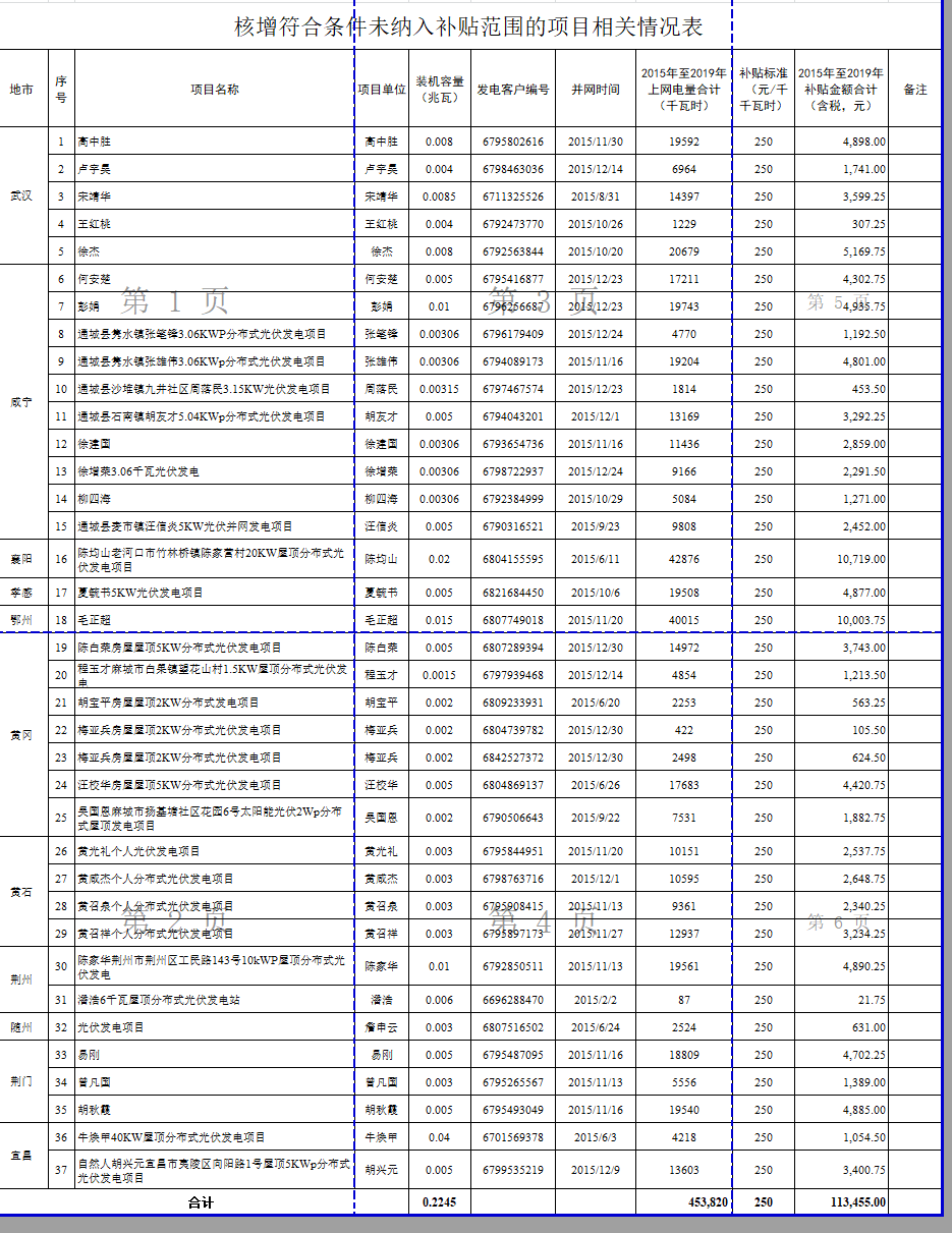 二、對符合條件但前期因各種因素未納入補貼范圍的項目,除納入本次補貼范圍外,再根據(jù)該項目實際并網(wǎng)日至2019年12月31日的上網(wǎng)電量發(fā)放補貼。此類項目共37個,補貼金額11.35萬元,具體見附件4。