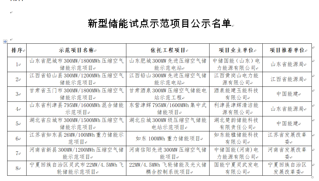12月27日,國家能源局綜合司發(fā)布的《關(guān)于公示新型儲(chǔ)能試點(diǎn)示范項(xiàng)目的通知》顯示,國家能源局委托第三方評(píng)估機(jī)構(gòu)組織專家評(píng)審,擬將“山東省肥城市300MW/1800MWh壓縮空氣儲(chǔ)能示范項(xiàng)目”等56個(gè)項(xiàng)目列為新型儲(chǔ)能試點(diǎn)示范項(xiàng)目并予以公示。