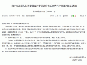 從南寧市發(fā)改委官網(wǎng)獲悉:據(jù)南寧市發(fā)展和改革委員會(huì)1月2日發(fā)布的關(guān)于促進(jìn)分布式光伏有序高效消納的通知, 為推進(jìn)優(yōu)化營(yíng)商環(huán)境提質(zhì)增效,促進(jìn)分布式光伏高效消納,助力分布式光伏市場(chǎng)健康有序發(fā)展,根據(jù)《國(guó)家能源局綜合司關(guān)于印發(fā)開(kāi)展分布式光伏接入電網(wǎng)承載力及提升措施評(píng)估試點(diǎn)工作的通知》、DLT2041-2019分布式電源接入電網(wǎng)承載力評(píng)估導(dǎo)則,將組織建立分布式光伏電網(wǎng)承載力預(yù)警機(jī)制。