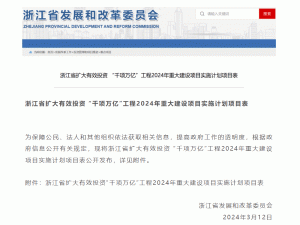 為深入實(shí)施擴(kuò)大有效投資“千項(xiàng)萬(wàn)億”工程,抓緊抓實(shí)項(xiàng)目建設(shè)各項(xiàng)工作,浙江省政府辦公廳近日還印發(fā)了《浙江省擴(kuò)大有效投資“千項(xiàng)萬(wàn)億”工程2024年重大建設(shè)項(xiàng)目實(shí)施計(jì)劃》及《2024年浙江省擴(kuò)大有效投資政策》。根據(jù)實(shí)施計(jì)劃,2024年推進(jìn)省重大建設(shè)項(xiàng)目1000個(gè)以上,計(jì)劃完成投資1萬(wàn)億元以上。第一批安排省重大建設(shè)項(xiàng)目1101個(gè),年度計(jì)劃投資10313億元。力爭(zhēng)新建項(xiàng)目開(kāi)工率達(dá)到100%,投資完成率超過(guò)100%。