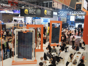 晶澳太陽能科技股份有限公司(簡稱“晶澳科技”)展臺上展示了各種功率和尺寸的太陽能電池板。據(jù)介紹,該公司的光伏產(chǎn)品在歐洲已有廣泛的應(yīng)用場景,從家庭到大型工廠和超市均有覆蓋。
