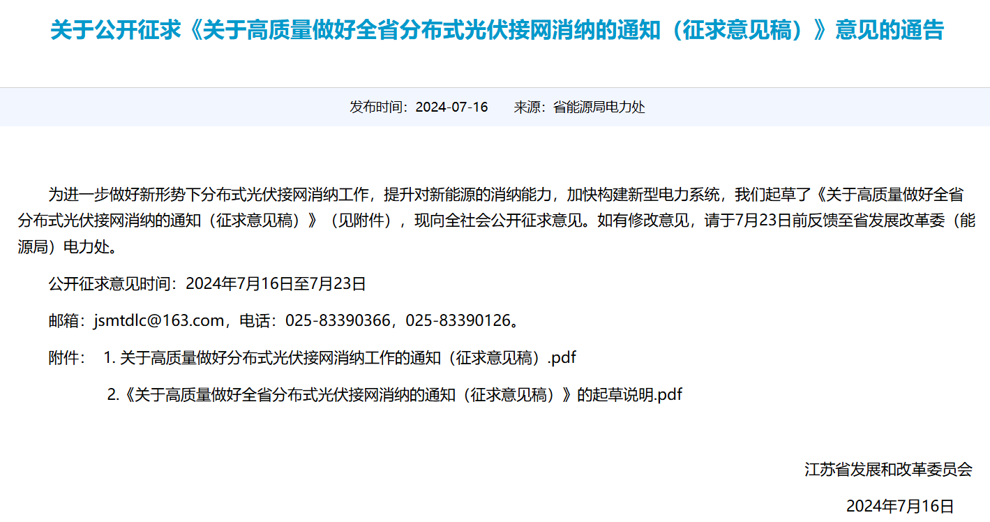 7月16日,江蘇省發(fā)改委印發(fā)《關(guān)于高質(zhì)量做好全省分布式光伏接網(wǎng)消納的通知(征求意見稿)》,為進一步做好新形勢下分布式光伏接網(wǎng)消納工作,提升