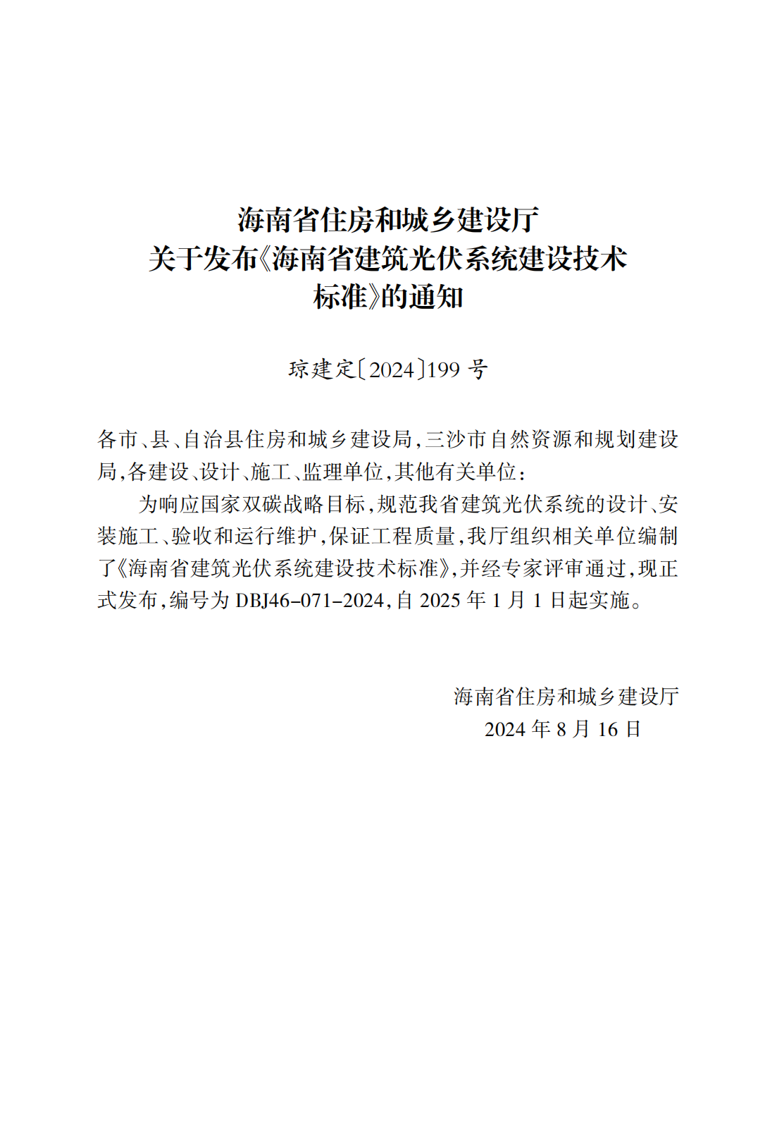 9月29日,海南省住建廳正式發(fā)布《海南省建筑光伏系統(tǒng)建設(shè)技術(shù)標(biāo)準(zhǔn)》,自2025年1月1日起實(shí)施。