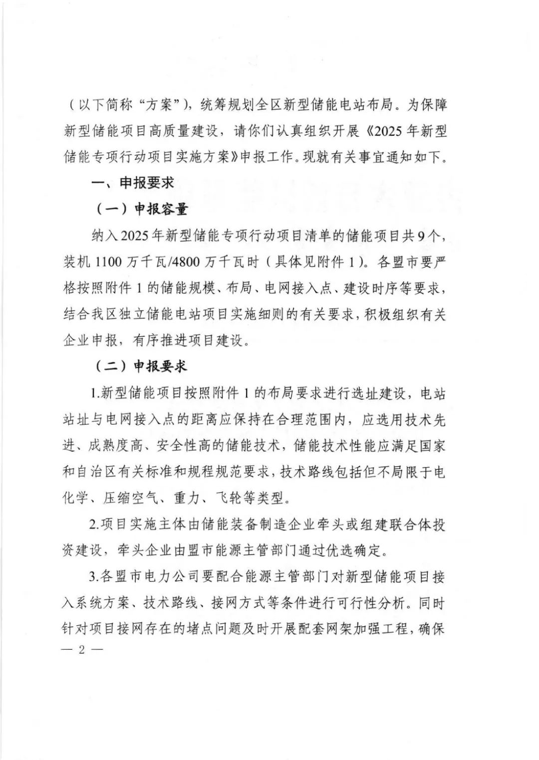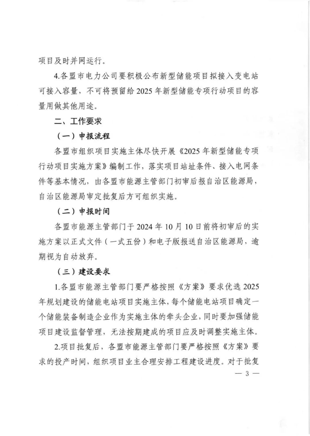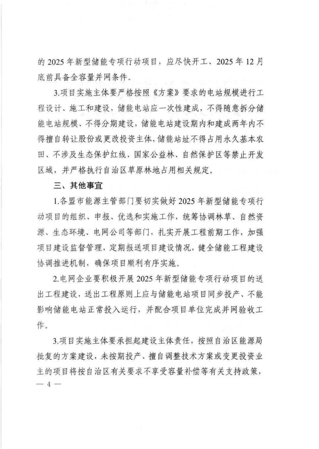 根據(jù)方案要求,各盟市能源主管部門(mén)于2024年10月10日前將初審后的實(shí)施方案以正式文件(一式五份)和電子版報(bào)送自治區(qū)能源局,逾期視為自動(dòng)放棄。對(duì)于批復(fù)的2025年新型儲(chǔ)能專項(xiàng)行動(dòng)項(xiàng)目,應(yīng)盡快開(kāi)工、2025年12月底前具備全容量并網(wǎng)條件。