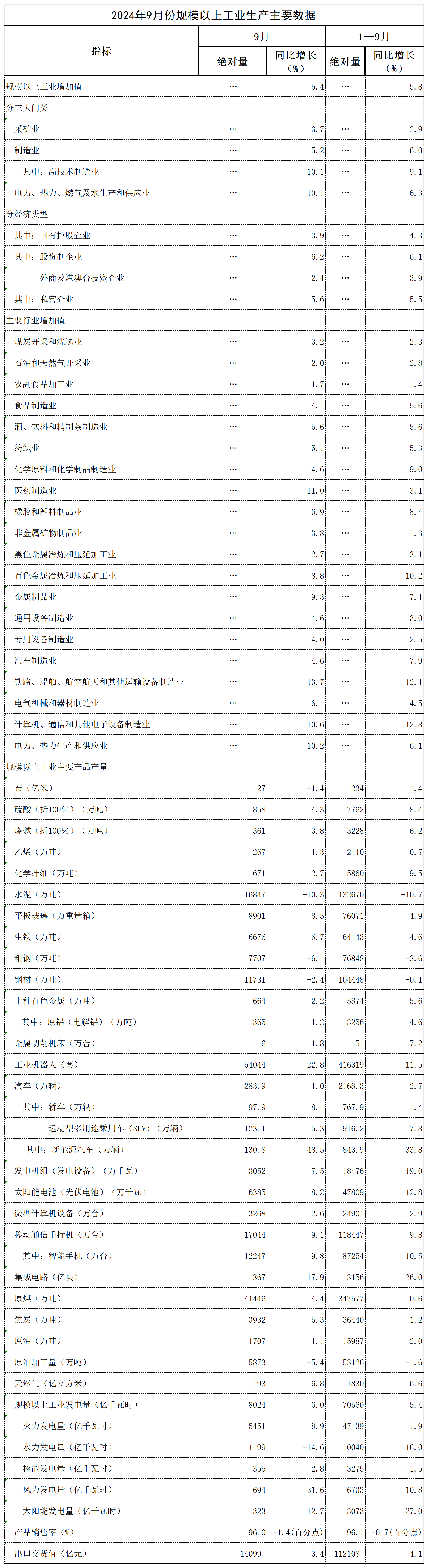 9月份規(guī)模以上工業(yè)生產(chǎn)主要數(shù)據(jù)如下: