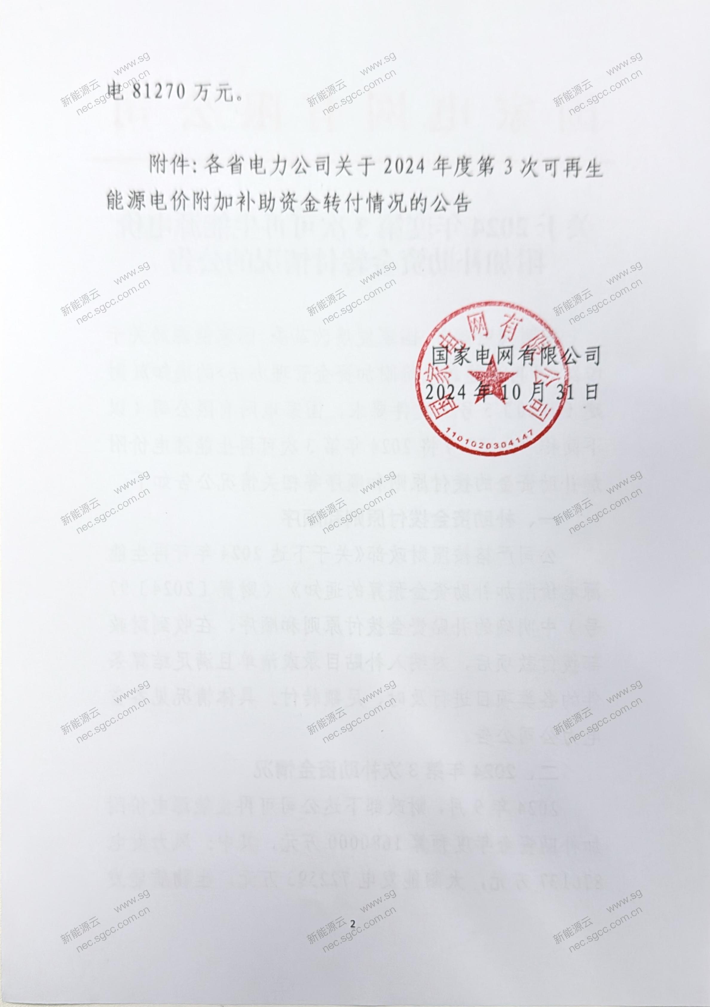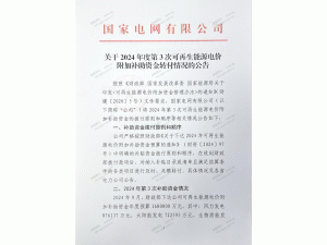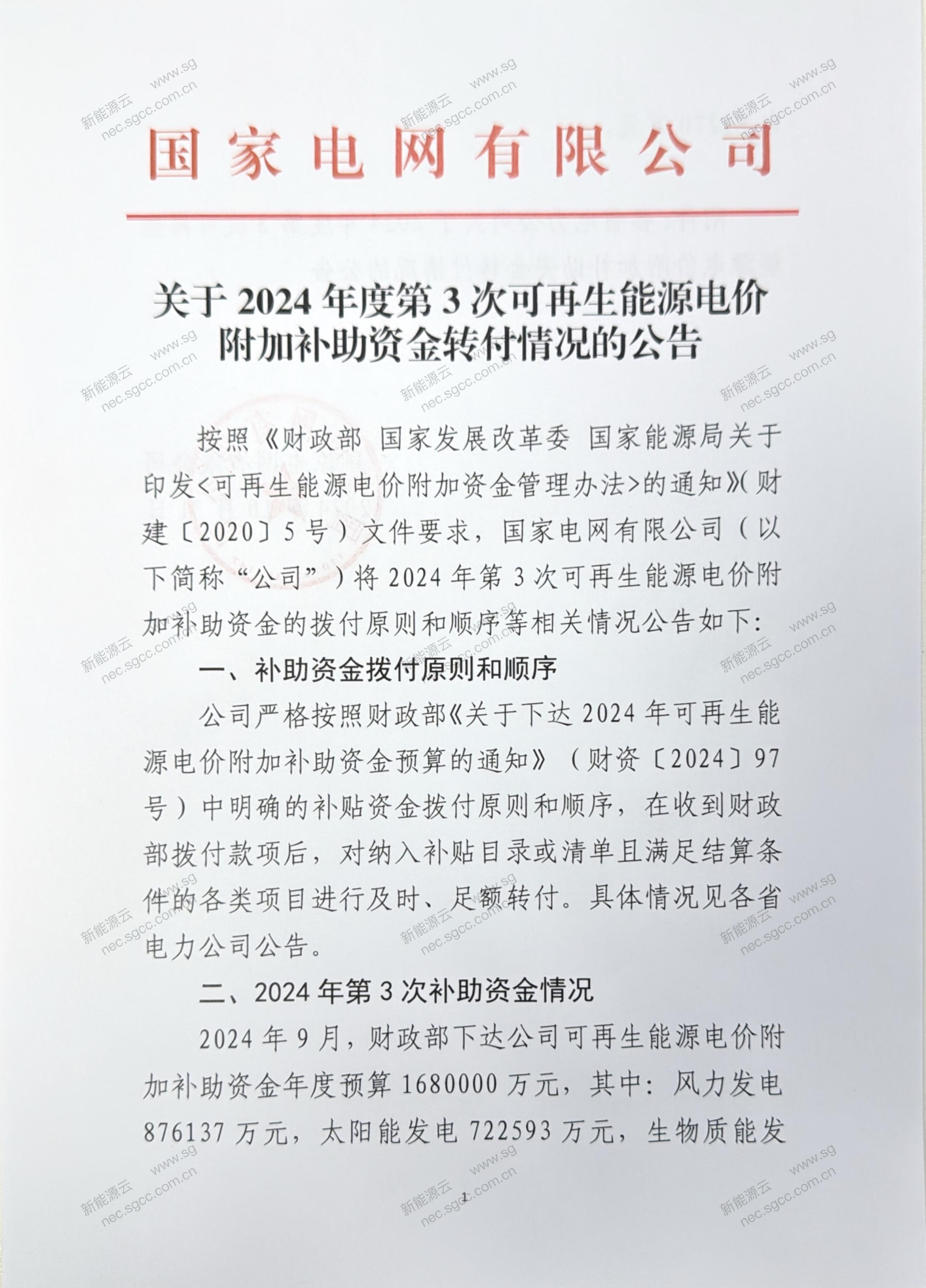 國家電網(wǎng) :2024年度第3次補助資金太陽能發(fā)電722593萬元