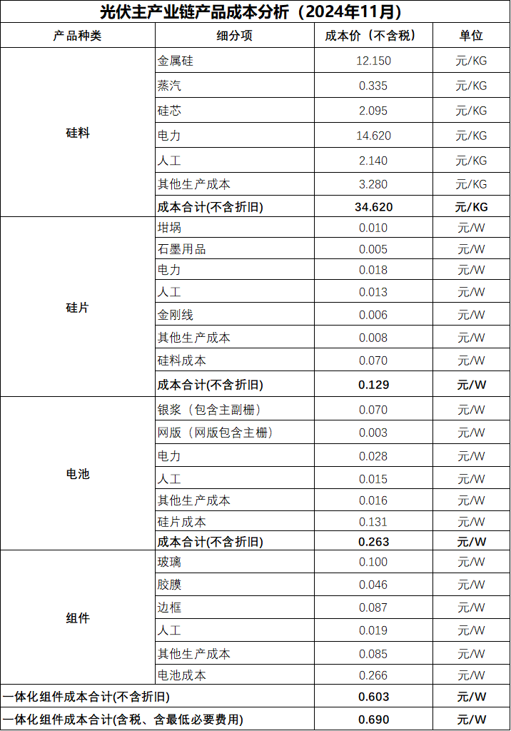 11月20日,中國光伏行業(yè)協(xié)會發(fā)布2024年11月上旬光伏主流產(chǎn)品(N型M10及G12R)各環(huán)節(jié)綜合成本數(shù)據(jù)。當(dāng)前,在各環(huán)節(jié)不計折舊,硅料、硅片、電池片環(huán)節(jié)不含增值稅的情況下,最終組件含稅成本(含最低必要費用)為0.690元/W。