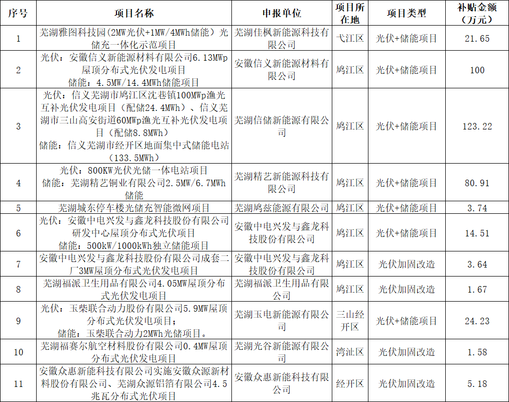 12月5日,安徽省蕪湖市發(fā)改委發(fā)布2024年蕪湖市光伏發(fā)電和儲能推廣應(yīng)用補(bǔ)貼項目公示,共涉及蕪湖雅圖科技園(2MW光伏+1MW/4MWh儲能)光儲充一體化示范項目等11個項目,補(bǔ)貼總額380.33萬元。