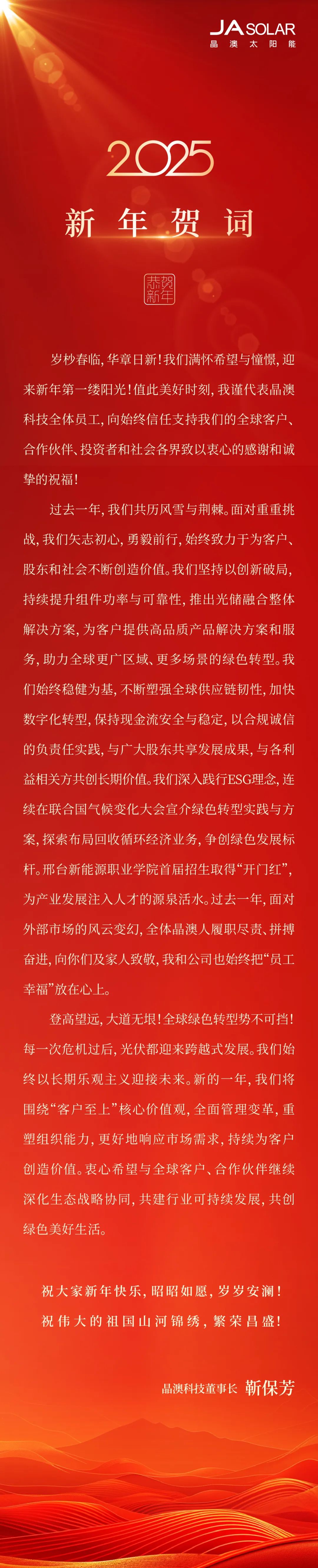 晶澳科技董事長(zhǎng)靳保芳新年賀詞