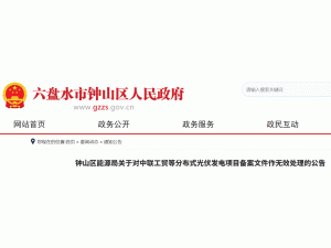 7月24日,貴州省六盤水市鐘山區(qū)能源局發(fā)布“關(guān)于對中聯(lián)工貿(mào)等分布式光伏發(fā)電項目備案文件作無效處理的公告”。