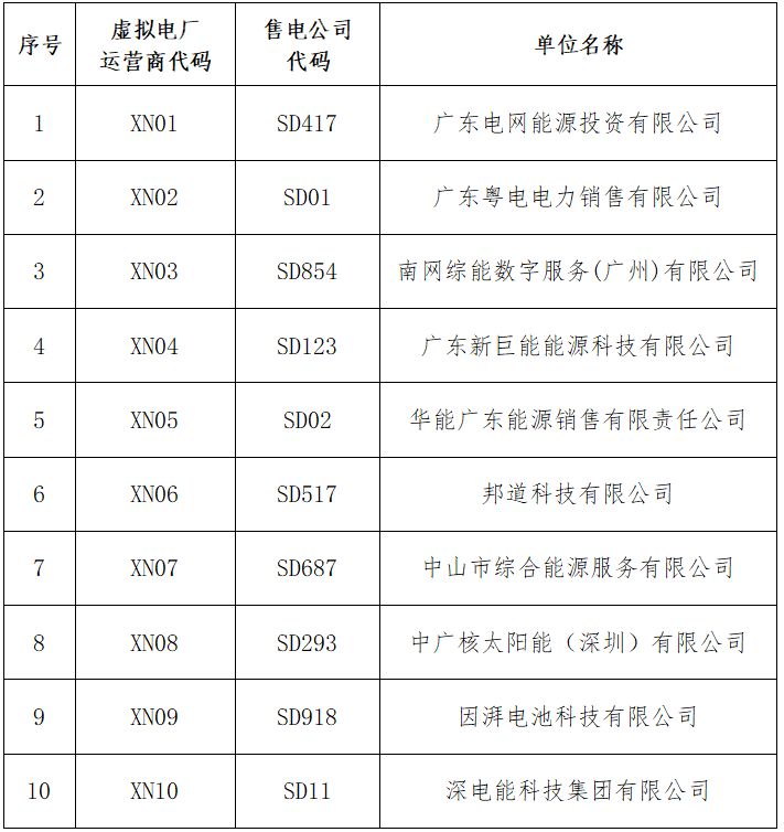 據(jù)9月19日廣東電力交易中心公布的第一批虛擬電廠運(yùn)營商名錄,廣東電網(wǎng)能源投資有限公司、廣東粵電電力銷售有限公司、南網(wǎng)綜能數(shù)字服務(wù)(廣州)有限公司、廣東新巨能能源科技有限公司、華能廣東能源銷售有限責(zé)任公司、邦道科技有限公司、中山市綜合能源服務(wù)有限公司、中廣核太陽能(深圳)有限公司、因湃電池科技有限公司、深電能科技集團(tuán)有限公司等10家企業(yè)列入虛擬電廠運(yùn)營目錄。