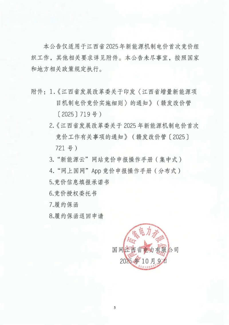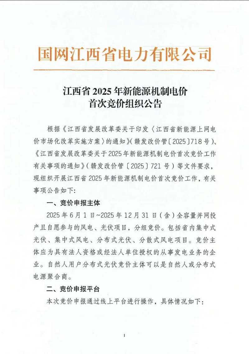 10月9日, 國(guó)網(wǎng)江西省電力有限公司發(fā)布2025年新能源機(jī)制電價(jià)首次競(jìng)價(jià)組織公告。全文如下: