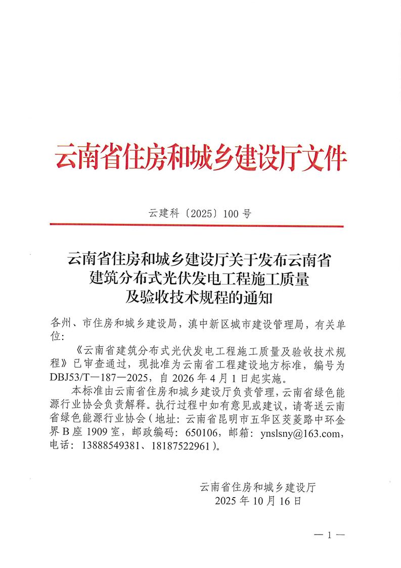 12月2日,云南省住房和城鄉(xiāng)建設(shè)廳為推動(dòng)太陽能光伏發(fā)電系統(tǒng)在建筑中的應(yīng)用,規(guī)范太陽能光伏發(fā)電工程的施工檢測(cè)和驗(yàn)收,確保工程質(zhì)量及系統(tǒng)安全運(yùn)行, 正式發(fā)布《云南省建筑分布式光伏發(fā)電工程施工質(zhì)量及驗(yàn)收技術(shù)規(guī)程》。