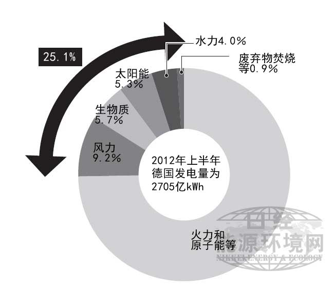 德國聯(lián)邦能源和水資源協(xié)會(BDEW,Bundesverband der Energieund Wasserwirtschaft)于2012年7月底宣布,2012年上半年德國的可再生能源發(fā)電量達(dá)到該國總發(fā)電量的25.1%。尤其是光伏發(fā)電(PV)的發(fā)電量增加明顯,同比增長了47%,一年即增至2011年約1.5倍。