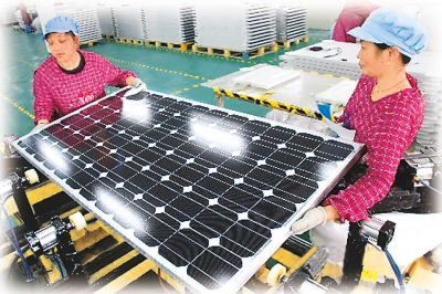 光伏企業(yè)員工在車間生產(chǎn)太陽能電池組件