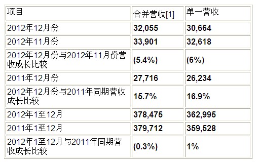 2012年第四季大尺寸出貨量約達(dá)三千零九十九萬(wàn)片,較第三季減少6.7%,與去年同期相比增加15.7%。第四季中小尺寸出貨量接近三千七百六十五萬(wàn)片,較2012年第三季減少10.8%,較去年同期下降19%。累計(jì)2012年全年大尺寸出貨量約為一億二千三百二十萬(wàn)片,比2011年增加7.6%;2012年全年中小尺寸出貨量則接近一億五千四百五十萬(wàn)片,與2011年相比則減少17.6%。