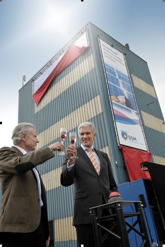 建成典禮上,帝斯曼首席創(chuàng)新官員Rob van Leen和帝斯曼Khepri Coat®產(chǎn)品在歐洲太陽(yáng)能行業(yè)的首家特許經(jīng)銷商Interfloat公司董事總經(jīng)理Ulrich Frei共同宣布新工廠成立。