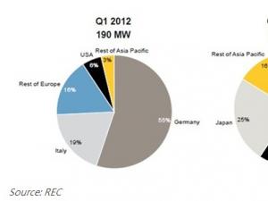由于歐洲市場成長趨緩,亞太市場后來居上,REC 2013年第一季對亞太的模組出貨量由2012年第一季的3%,成長到41%,尤其是日本占比達到25%,另一方面對歐洲的出貨量則由2012年第一季的90%下降到46%。