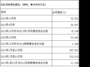 2013年11月7日,友達光電公布2013年10月自行結(jié)算合并營業(yè)額為新臺幣339.22億元,較9月份減少8.1%,較去年同期上升1.4%。