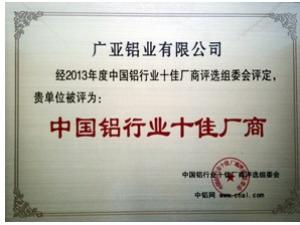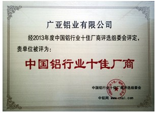 經(jīng)過網(wǎng)站報名、網(wǎng)民投票推薦和中鋁網(wǎng)專家評審團(tuán)評,最終評選出各項獎項。廣亞鋁業(yè)以其雄厚的實(shí)力與廣亞鋁業(yè)集團(tuán)全體人員的努力獲得了“中國鋁行業(yè)十佳廠商”及“中國鋁工業(yè)百強(qiáng)”殊榮。
