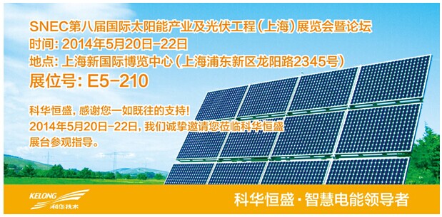 科華恒盛誠邀您出席2014SNEC第八屆國際太陽能產業(yè)及光伏工程(上海)展覽會暨論壇,蒞臨科華恒盛展臺。我們將從新能源光伏、技術創(chuàng)新及商業(yè)模式等多個維度,和您共同探討產業(yè)發(fā)展的熱點話題,并借助大會論壇、高層對話、展廳體驗等豐富的形式,分享科華恒盛觀點及最新的產品和解決方案,與您一起勾勒世界新能源產業(yè)發(fā)展的美好藍圖。