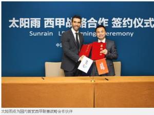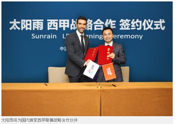 2014年6月2日,上海波特曼麗嘉酒店,太陽雨集團(tuán)正式簽約西班牙甲級聯(lián)賽(LFP),成為國內(nèi)首家西甲聯(lián)賽戰(zhàn)略合作伙伴。太陽雨集團(tuán)總裁陳榮華、西甲中國區(qū)主席Fernando Sanz分別代表太陽雨和LFP出席戰(zhàn)略合作簽字儀式,并與眾多國內(nèi)主流媒體共同見證這一歷史性時刻。