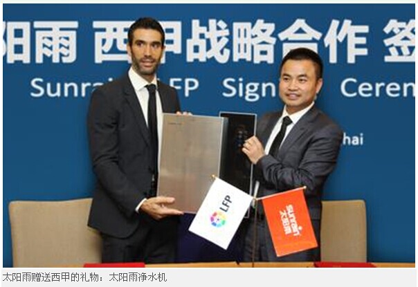 在接受記者現(xiàn)場采訪時,太陽雨集團(tuán)總裁陳榮華表示:“此次太陽雨聯(lián)姻西甲,成為LFP戰(zhàn)略合作伙伴,是太陽雨大光熱發(fā)展戰(zhàn)略的一部分。我們從去年就開始積極籌備相關(guān)資源,并最終確立了與西甲聯(lián)賽的戰(zhàn)略合作關(guān)系。2014年是太陽雨大光熱的元年,陽光、空氣、水,是生命最重要的三元素,也是太陽雨的核心業(yè)務(wù),圍繞健康水生活這一中心,太陽雨將持續(xù)以自然能源創(chuàng)造智慧生活。這是太陽雨的生態(tài)使命,也是太陽雨的榮耀與夢想。”
