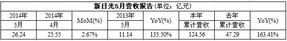 新日光能源科技(3576 TT)公告2014年5月份自結合并營收為新臺幣26.24億元,較4月營收成長2.67%,連續(xù)第三個月再創(chuàng)歷史新高。