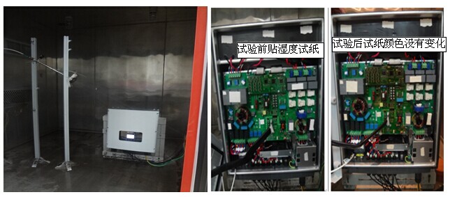 淋雨試驗在一個大的溫濕度箱進行的,有專門設備控制噴淋的大小和方向,逆變器在70℃/95%溫濕度工作一段時長后,對逆變器外殼噴淋涼水。實驗前在逆變器內(nèi)部單板、外殼內(nèi)側(cè)壁、關(guān)鍵器件、散熱器等關(guān)鍵部位貼濕敏試紙,對比試驗前后試紙顏色變化,來判斷是否有凝露發(fā)生。整個試驗過程中,逆變器帶電運行,實時遠程監(jiān)控運行狀態(tài)。