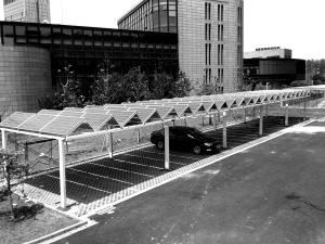 呈45°角斜置的太陽能電池猶如一片片巨型瓦片,布滿整個車棚頂部,在嘉興科技城內(nèi)的浙江中科院應(yīng)用技術(shù)研究院,就有這么一個特殊的簡易停車棚。太陽能電池既充當(dāng)了頂棚,為底下的車子擋住了日曬雨淋,又提供免費(fèi)充電服務(wù),這個車棚也成為最受歡迎的車棚。這就是浙江科民能源科技有限公司自主研發(fā)的黑硅太陽能電池