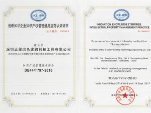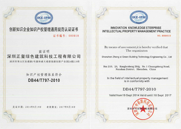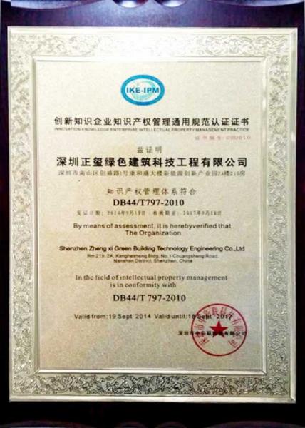 廣東省創(chuàng)新知識產(chǎn)權管理通用規(guī)范認證證書 近日,深圳正璽綠色建筑新科技工程有限公司榮獲由廣東省知識產(chǎn)權局頒發(fā)的《創(chuàng)新知識企業(yè)知識產(chǎn)權管理通用規(guī)范認證證書》,這表明深圳正璽公司在完善知識產(chǎn)權管理、有效運用知識產(chǎn)權制度方面得到了權威專業(yè)的認可。
