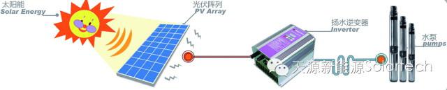 光伏揚水技術(shù)研究示范基地 天源新能源的光伏揚水系統(tǒng)技術(shù)以及其在全球的推廣和應(yīng)用榮獲2014年聯(lián)合國全球人居環(huán)境最佳技術(shù)范例獎。該系統(tǒng)主要是由太陽能電池陣列、光伏逆變器和光伏水泵三部分組成。太陽電池陣列由多塊太陽電池組件串并聯(lián)而成,吸收日照輻射能量,將其轉(zhuǎn)化為電能,為整個系統(tǒng)提供動力電源。光伏揚水逆變器對系統(tǒng)的運行實施控制和調(diào)節(jié),應(yīng)用太陽電池陣列發(fā)出的電力驅(qū)動水泵,并根據(jù)日照強(qiáng)度的變化實時地調(diào)節(jié)輸出頻率,實現(xiàn)最大功率點跟蹤,最大限度地利用太陽能。水泵由電機(jī)驅(qū)動,從深井或河流中提水應(yīng)用。基于在太陽能揚水系統(tǒng)中蓄電不如蓄水的設(shè)計思路,沒有配置蓄電池,從而達(dá)到簡化系統(tǒng),降低成本的目的。