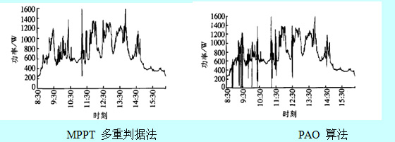 圖1是天源的MPPT多重判據(jù)法與普通的PAO法在多云天氣下的對比實驗結(jié)果。在全天出現(xiàn)多次光照強(qiáng)度大幅波動的情況下,采用PAO法的系統(tǒng)多次中斷運行,而采用MPPT多重判據(jù)法的系統(tǒng)則能快速跟蹤光照強(qiáng)度變化,避免系統(tǒng)停機(jī)重啟,提供運行效率。