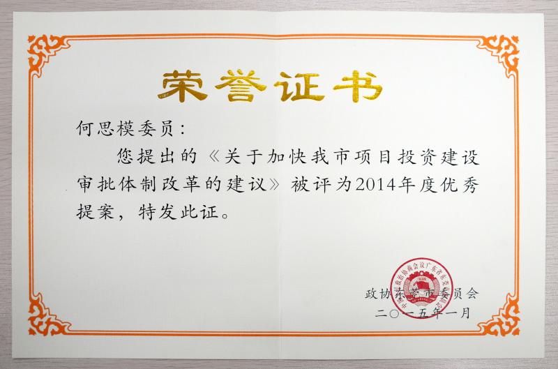 據(jù)悉,董事長何思模教授在致力于公司管理持續(xù)改善,業(yè)績不斷提升的同時,積極履行社會責任,參政議政,服務社會發(fā)展。在擔任東莞市政協(xié)委員、常委期間,積極參與社會活動,并為東莞市的經(jīng)濟建設(shè)和社會發(fā)展建言獻策。他提出的《綜合治理搞好社會治安,打造和諧東莞》、《關(guān)于推動東莞市企業(yè)進入資本市場的建議》、《加快產(chǎn)權(quán)證的辦理速度,救助中小企業(yè)“過冬”》、《加大本土知名“工業(yè)龍頭企業(yè)”扶持力度,構(gòu)建東莞“華為”類本土自主品牌的建議》等多份提案先后被評為優(yōu)秀提案并獲表彰。在本次政協(xié)會議期間,何思模教授提出的《關(guān)于加快我市項目投資建設(shè)審批體制改革的建議》再次榮獲2014年度優(yōu)秀提案。