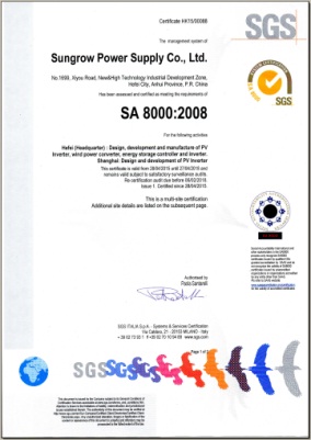 近年來,為積極承擔(dān)更多社會責(zé)任,更好地接軌國際市場,為國內(nèi)外客戶提供更加符合道德要求的產(chǎn)品與服務(wù),陽光電源在行業(yè)率先引進(jìn)并全面貫徹實施全球首個道德規(guī)范國際標(biāo)準(zhǔn)SA8000社會責(zé)任標(biāo)準(zhǔn),嚴(yán)格落實企業(yè)社會責(zé)任,在追求產(chǎn)品質(zhì)量、經(jīng)濟(jì)效益和環(huán)境效益的同時,不斷改進(jìn)員工工作環(huán)境、改善員工利益,已成功在安全衛(wèi)生、工作時間、報酬與福利、職業(yè)健康等方面達(dá)到并超越了SA8000社會責(zé)任標(biāo)準(zhǔn)的各項要求,也得到了客戶與認(rèn)證機(jī)構(gòu)的高度評價和充分認(rèn)可。