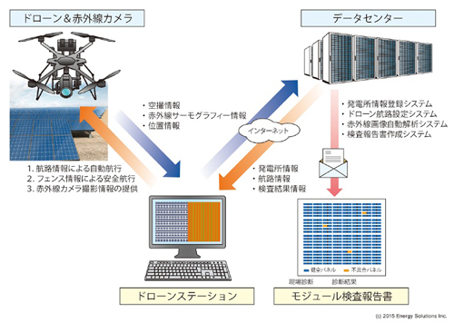 公布的檢查服務(wù)設(shè)想如下:令配備紅外相機的無人機自動飛行。輸出1MW的光伏電站,用約20分鐘拍完全部電池板,并保存至數(shù)據(jù)庫。攝影數(shù)據(jù)利用云服務(wù)基本以實時分析,并在線報告給運營商。