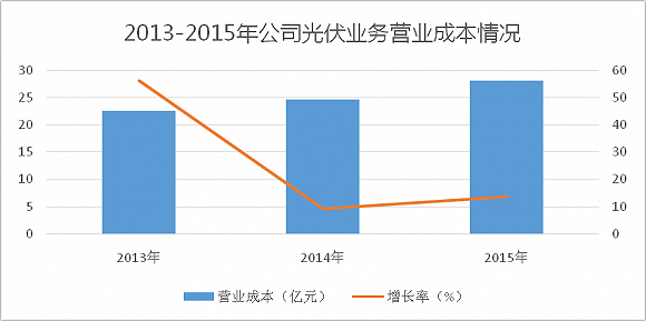 2013-2015年公司光伏業(yè)務毛利率、綜合毛利率對比 從上圖的對比中,不難發(fā)現(xiàn),航天機電光伏業(yè)務的毛利率走勢對公司產品的綜合毛利率影響頗深?v觀其近三年的營業(yè)成本,這個“主心骨”業(yè)務已陷入成本逐年增加的“泥淖”。在扭虧為盈的2013年,航天機電當年的光伏業(yè)務營收額雖然翻倍從而帶動公司總營收增至35.59億元,但該項業(yè)務的營業(yè)成本卻也高達22.51億元,同比大增56.20%。2014年,公司的光伏業(yè)務毛利率因價格提升增長至18.25%,但該業(yè)務的成本依舊繼續(xù)增長了近10%,為24.59億元。去年,公司光伏業(yè)務營收成本的增長率放大至13.53%,達28.08億元,這便直接造成其毛利率下降至15.41%,并明顯拖累了公司凈利潤的絕對值。對此,廣發(fā)證券的分析師給出了公司業(yè)績低于預期的風險提示。