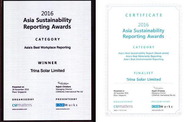 近日,在新加坡舉行的2016亞洲可持續(xù)報(bào)告獎(jiǎng)(ASRA)的評(píng)選中,天合光能從眾多候選企業(yè)中脫穎而出,獲得了“亞洲最佳工作場(chǎng)所報(bào)告獎(jiǎng)”。