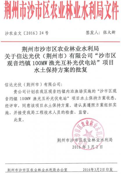 信達(dá)光伏還在郵件中寫道,荊州市沙市區(qū)農(nóng)業(yè)林業(yè)水利局批復(fù)了該項(xiàng)目的水土保持方案,荊州市國(guó)土資源局沙市分局批復(fù)了該項(xiàng)目設(shè)施農(nóng)用地備案要求。