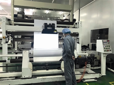 經(jīng)過除塵、穿防護(hù)服等嚴(yán)格程序,記者進(jìn)入福膜新材料科技有限公司的生產(chǎn)車間。生產(chǎn)車間內(nèi)并沒有多少工人,自動(dòng)化運(yùn)行的生產(chǎn)線經(jīng)過加料、加工等各個(gè)環(huán)節(jié),乳白色的薄膜源源不斷地從生產(chǎn)線上出來。