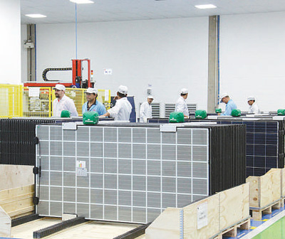 在剛剛落成的比亞迪太陽能板廠里,工作人員已經(jīng)在生產(chǎn)線旁忙碌,一面面剛生產(chǎn)出的藍(lán)色太陽能板整齊排列,這間工廠將成為巴西最大的太陽能廠之一。“目前巴西太陽能年產(chǎn)能1200兆瓦,這間工廠的年產(chǎn)能約為巴西年產(chǎn)能的20%,以約110萬人口的坎皮納斯市為例,該太陽能板廠可提供該市約10%的能源供應(yīng)!北葋喌习臀髫(fù)責(zé)人李鐵說。