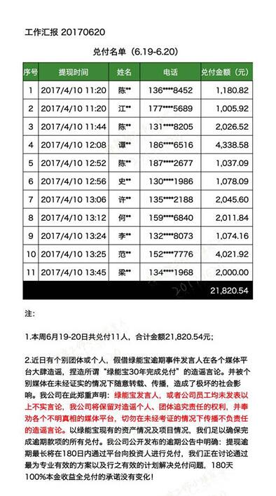 6月20日,綠能寶再次發(fā)布公告,6月19日到20日,共兌付11人,合計(jì)金額21820.54元。綠能寶在此次公告中特別強(qiáng)調(diào),180天100%本金收益全兌付的承諾沒有變化。