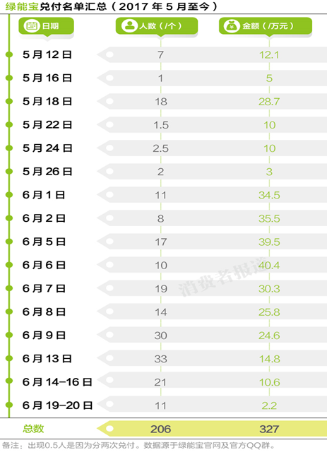 記者統(tǒng)計綠能寶自逾期事件以來的兌付情況發(fā)現(xiàn),截止6月21日,綠能寶共兌付206個人,總金額327萬,兌付僅完成約1.5%。根據(jù)綠能寶5月9日公布的《綠能寶逾期情況公示》,稱自4月17日起計,確保180天內(nèi)完成所有兌付。