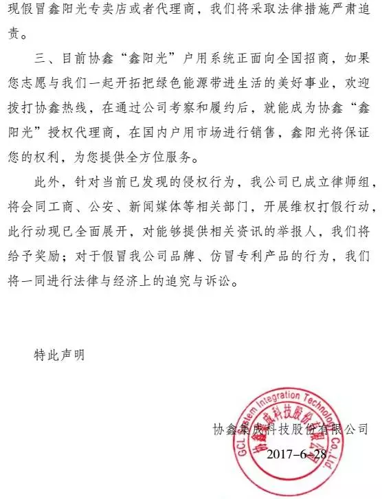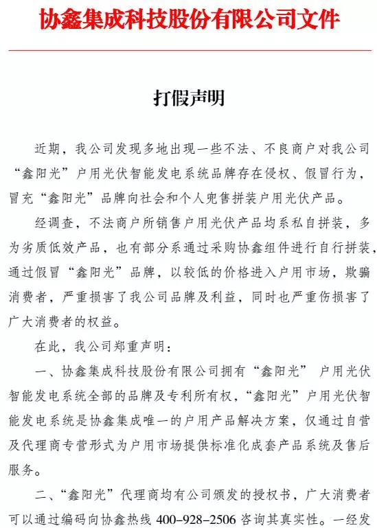 隨著戶用分布式光伏電站的日益普及,各大光伏品牌紛紛布局戶用分布式市場(chǎng)的同時(shí),“拼裝機(jī)”借品牌“原裝機(jī)”之名魚目混珠的亂象也愈演愈烈。28日晚間,協(xié)鑫集成官方微信推出“鑫陽(yáng)光”打假聲明,以保障消費(fèi)者及授權(quán)經(jīng)銷商的合法權(quán)益。