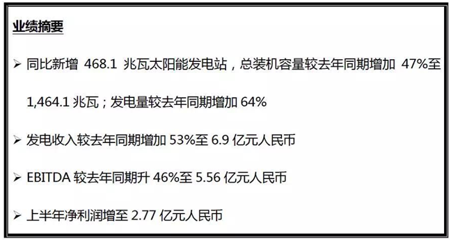 2017年8月31日,全球領(lǐng)先的生態(tài)發(fā)展解決方案供應(yīng)商——熊貓綠色能源集團(tuán)有限公司(00686.HK,“熊貓綠能”,前稱“聯(lián)合光伏”,連同其附屬公司統(tǒng)稱為“本集團(tuán)”),欣然宣布截至2017年6月30日止(“期內(nèi)”)之中期業(yè)績;仡櫰趦(nèi),本集團(tuán)發(fā)電收入同比增長53%至6.9億元人民幣;EBITDA較2016年同期大增46%至5.56億元人民幣;凈利潤增長至2.77億元人民幣。